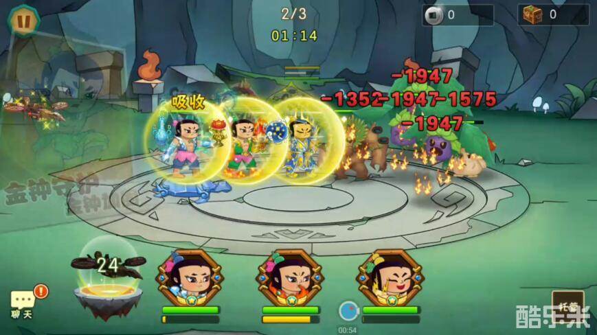 进图使用四娃双倍技能,五娃可以等蘑菇攻击一次的时候使用技能(主要是预防这次攻击被中毒)迅速为三娃回复能量。三娃能量满開护盾保护武装。四娃技能有缓冲时间,可以用来托时间等法宝CD,且第二关输出毫无压力。飞机CD完后使用,进入第三关。