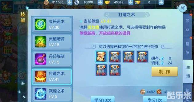 学习升级打造之术,升级生活技能需要消耗大量铜币和仙盟贡献,在生活技能达到等级时,才可制作当前级别打造图纸。
