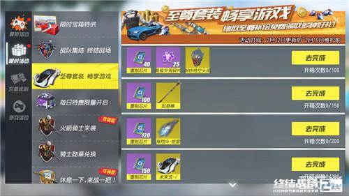 玩家在抽取至尊补给时,还有机会获得跑车载具外观“未来式-I”、伴飞滑翔伞外观“惊雷”、苍蝇拍外观“如意棒”以及人物外观“钢铁悟空”套装。在2月19日维护前集齐“钢铁悟空”套装的玩家,还将获得特别奖励“雷霆手环”。