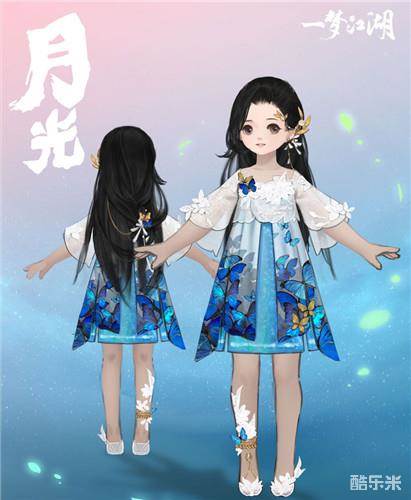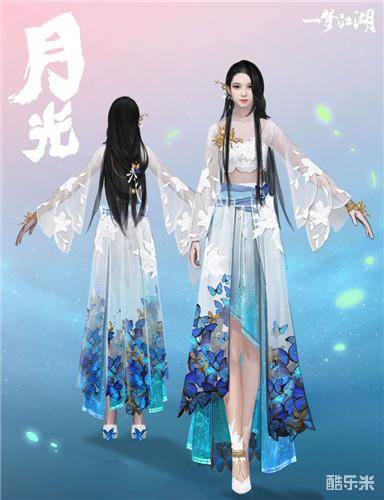 “月光”成女款式轻纱曼拢,贴合肌肤,线条婉约。女少侠们难得穿起了露腰款式,上衣缩短,穿起长裙,更显得身姿曼妙婀娜。月色之下,一名神秘女子,长发飘飘,衣衫轻扬,在月色的映衬下,裙摆的蓝色蝴蝶们仿佛活了起来,翩翩起舞。