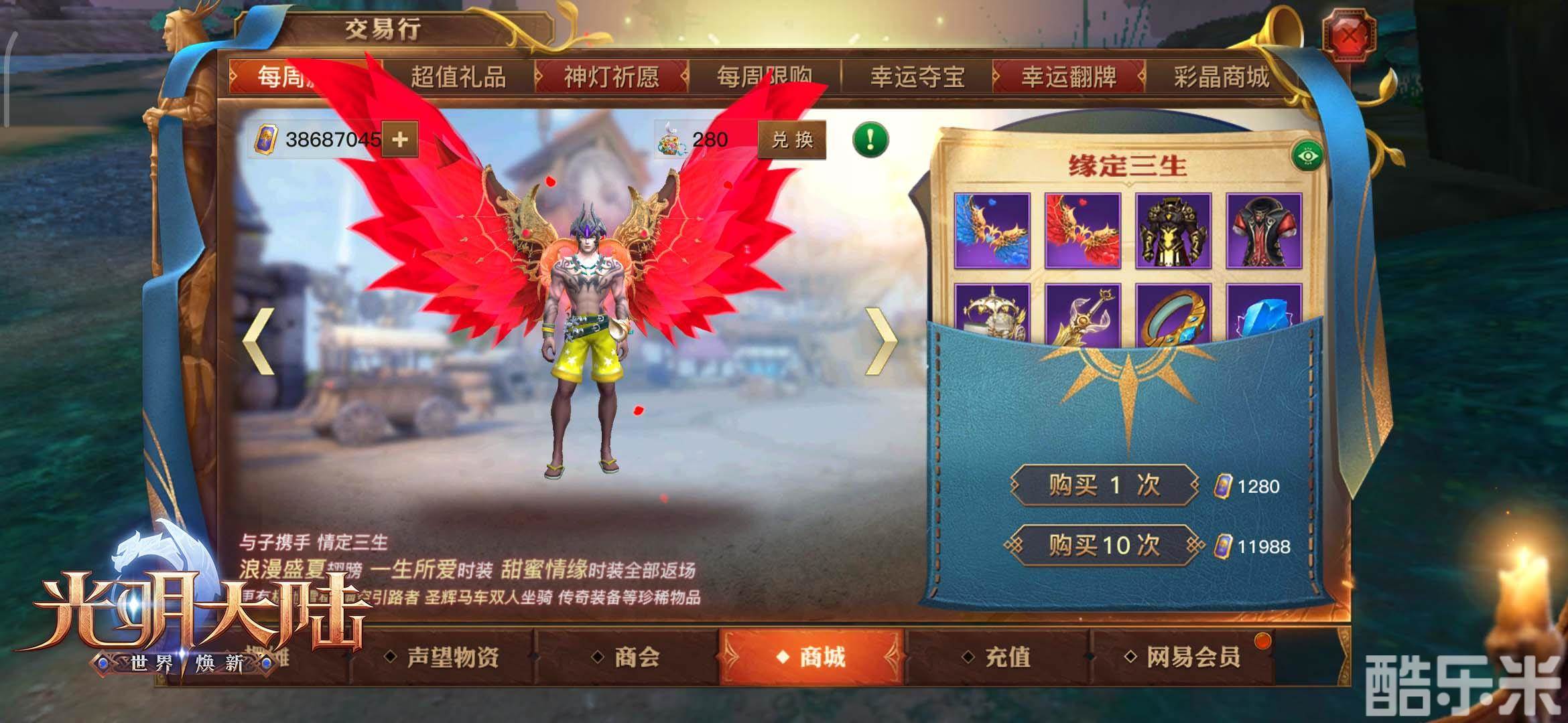 勇士每次购买“三生三世”即可获得1个积分道具,积分可以兑换“浪漫盛夏” 翅膀等珍稀道具。