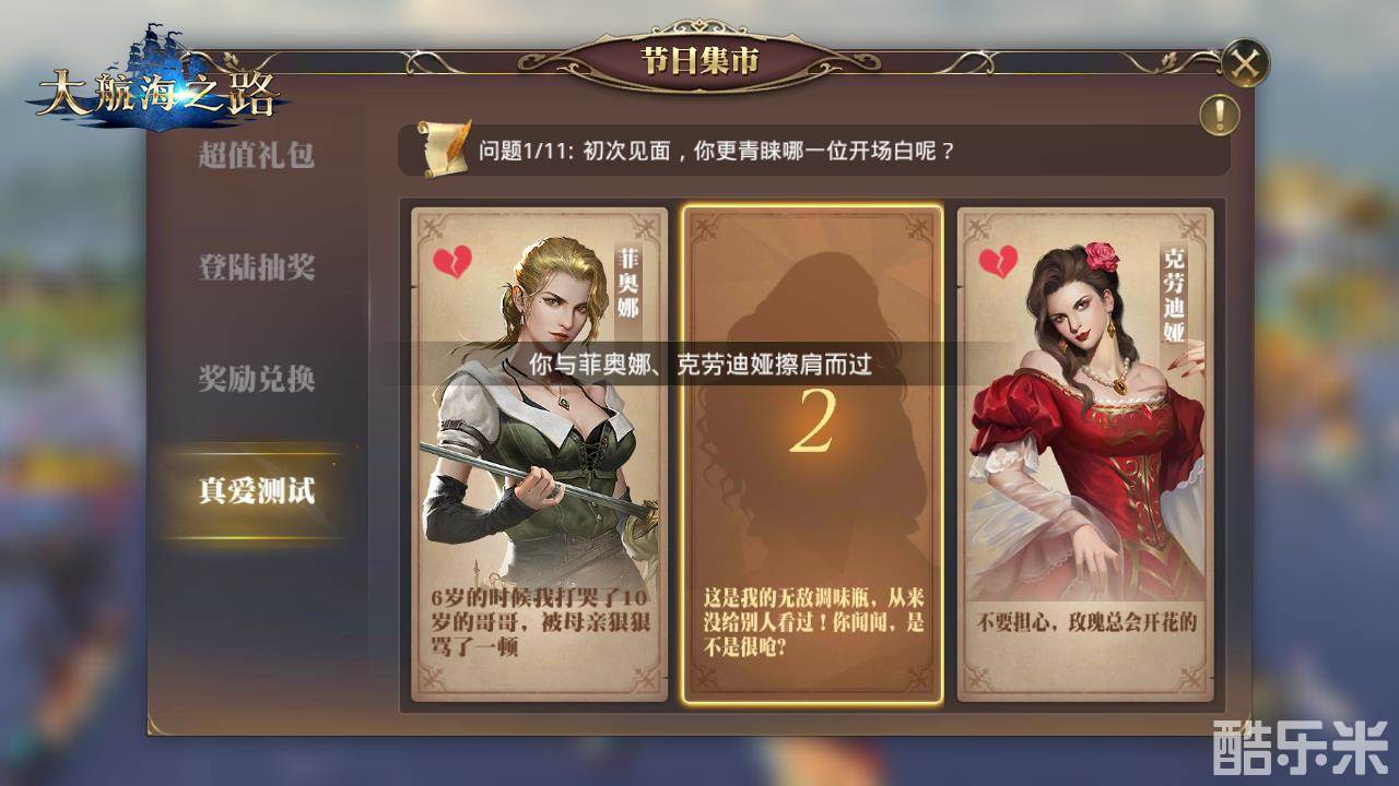 酒吧招待各具风情,让人目不暇接,那么哪一位才是你的真爱呢?来试着选一下吧!各位船长将通过测试,盲选出与自己聊天最为投缘的一位吧女,并获得丰厚的真爱奖励,同时将提升选中的酒吧招待在爱心大作战中的人气值,千万不要错过哦!在这个浪漫的情人节,愿各位船长能够在海上世界获得属于自己的真爱!