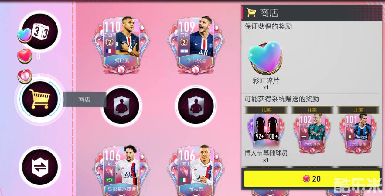 本章节中,玩家可以通过上一章节获得的情人节爱心兑换彩虹碎片来抽取强力球星。