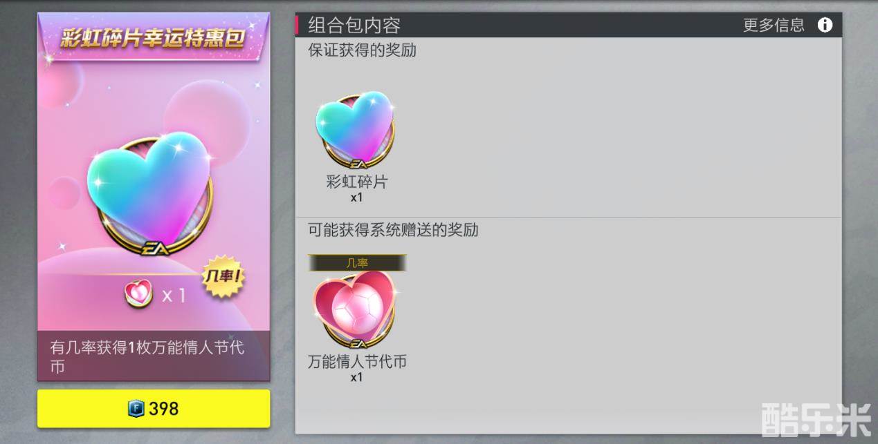 彩虹碎片幸运特惠包:必开出彩虹碎片,还有几率获得万能情人节代币!