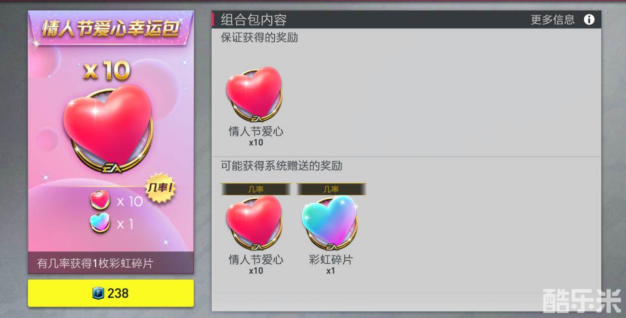 情人节爱心幸运包:必开出10枚情人节爱心,还有机会翻倍获取,甚至还有机会赢得1枚彩虹碎片!