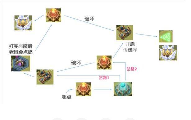 首先我们想要获得左侧宝箱需要走岔路1,这时候会碰到斥候老鼠一同击败恶魔,老鼠还会帮你破坏左上方的祭坛,烧出一条路后我们就能得到左侧的宝箱了,但是右边的斥候小黑就会逃跑了,我们是没有办法拿到右边宝箱的,只能单独再开一次获得。