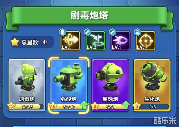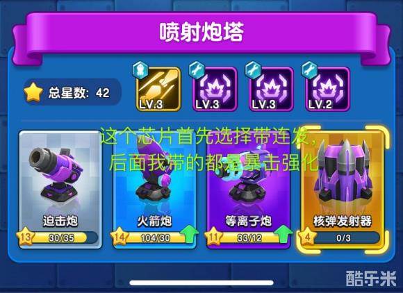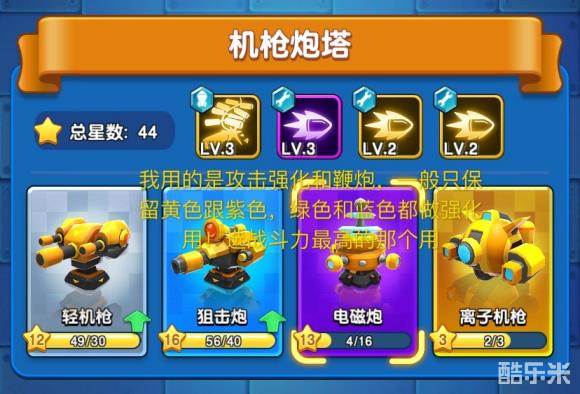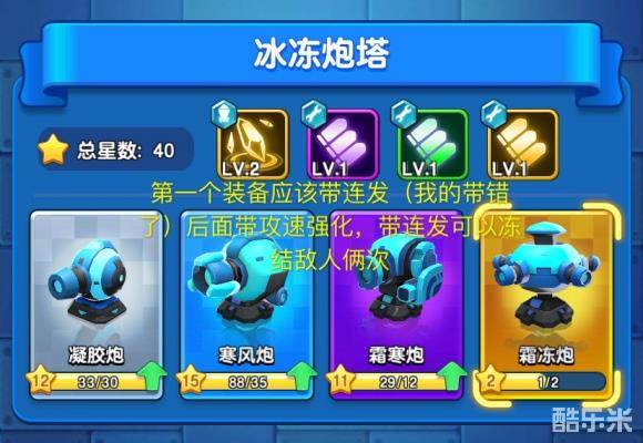 总星数记得先升级机枪和那个喷射炮塔,在是升级冰冻,炮塔40级可以带4个装备,别把零件乱用了