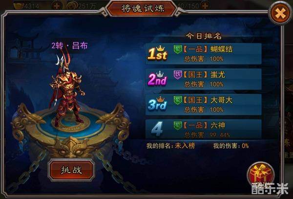 排名奖励:系统每天会对所有参加过将魂试炼的玩家进行统计,对怪物造成伤害排名前1000名的主公们可以根据自己的名次获得相应的铜钱奖励。