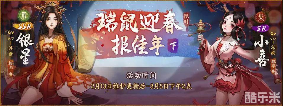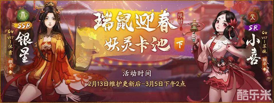 银星和小喜都已加入“瑞鼠迎春报佳年·下”卡池和“瑞鼠迎春·下”仅妖灵卡池,截止3月5日14时前都将等候降妖师的召唤,且召唤概率将大幅提升。