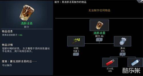 黑色幸存者清肝凉茶是一类使用后可以获得46点耐力的物品,可以为玩家的探索发现提供不错的效益。那么黑色幸存者清肝凉茶怎么制作呢、清肝凉茶需要什么材料呢,快来看看吧。