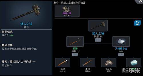 A、矮人之锤:通过战锤和艾德曼合金合成制作。其中,战锤需要铁锤和矛柄制作,艾德曼合金则需秘银和铁矿石加工制作;