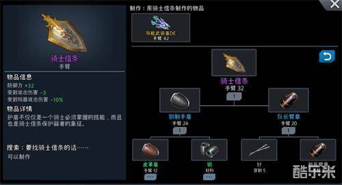 其中,骑士信条需要钢制手盾和队长臂章合成,前者通过钢和皮革盾制作(PS:皮革盾通过龟壳、皮革合成,钢通过废铁和铁矿石制作);队长臂章需要针和新兵臂章制作。
