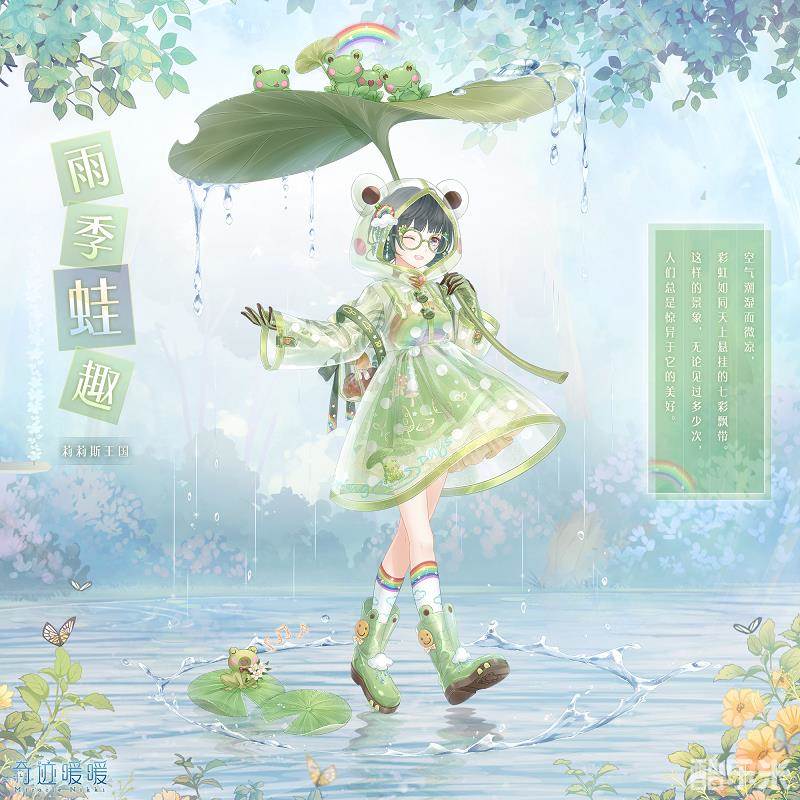 【雨季蛙趣】含正常姿势与特殊姿势,特殊姿势鞋子“新雨初谛”,精美荷叶手持“雨后新荷”,精美可移动摆件“小小蛙声”。海报展示妆容为“心之光彩”,可通过设计图制作获得。