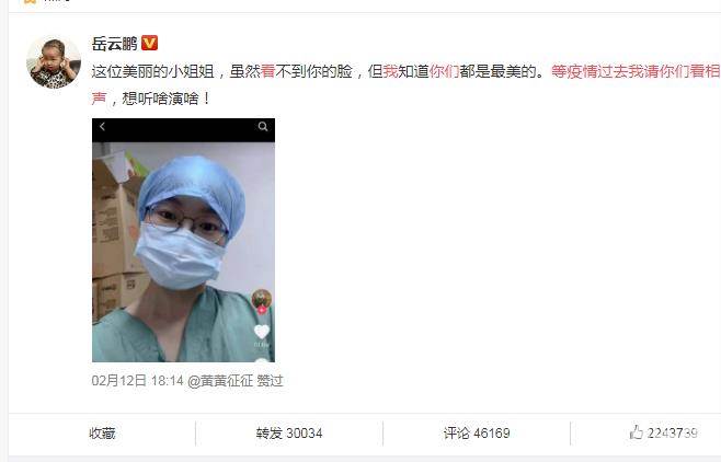 2月11日,山东大学齐鲁医院的援汉护士李雅琼在网上喊话@岳云鹏 ,称“想看演出,想开怀大笑”,随后岳云鹏在微博上回应“想听啥演啥”。