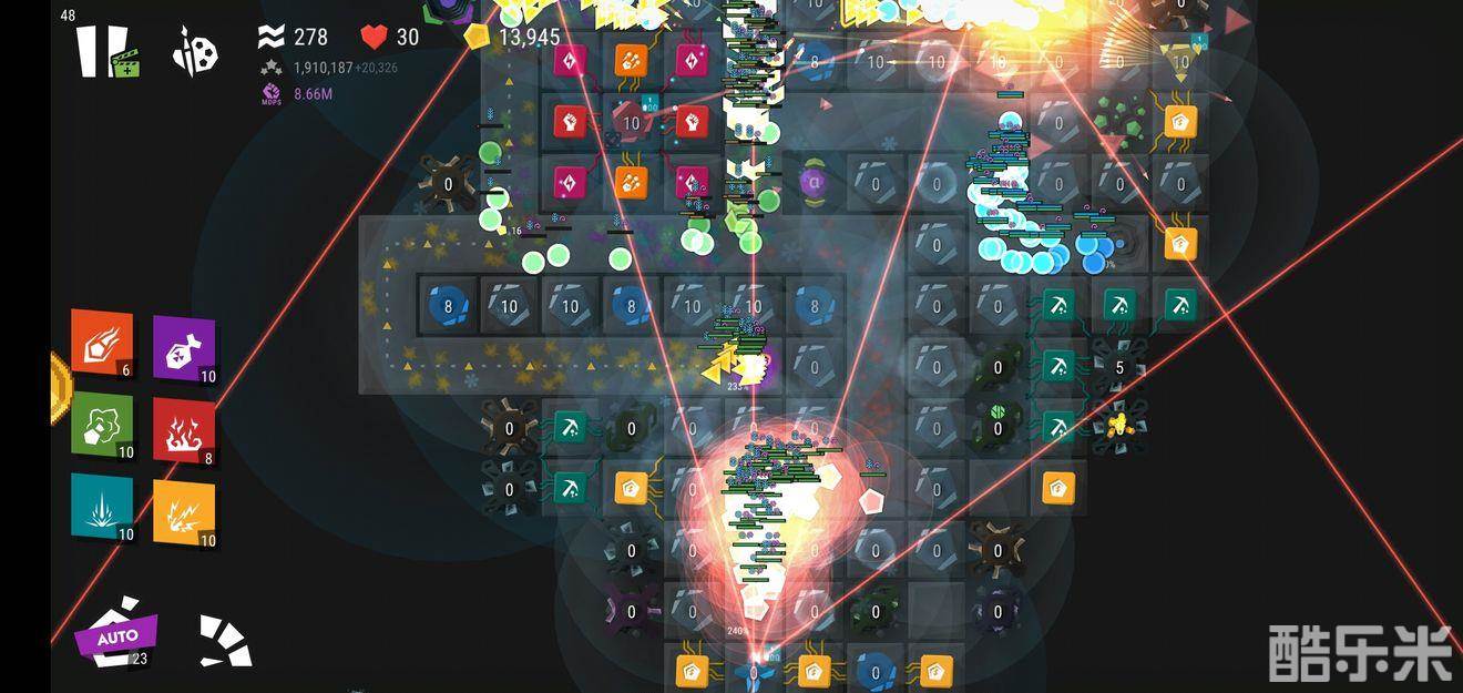 这样子下完注意右边的多重射击因为旁边有赏金芯片,所以可以迟点下,让他打足伤害又不会杀死怪,放下去之后别升等级。注意加农上下左右攻速和伤害芯片的位置,要让攻速芯片的角在爆破上,攻速芯片的四个角是减伤害的,这点伤害对爆破塔不算什么,相对的,伤害芯片的减攻速对爆破影响就比较大。