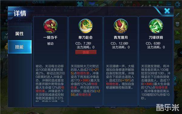 关羽的被动技能是他的特点之一,每主动移动100距离就能提高2%的速度,直到移动到2000距离时,关羽便会进入冲锋姿态。冲锋姿态下,关羽的普通攻击也会大大增加伤害,与此同时,关羽在冲锋姿态下面朝敌人还能获得20%的移速加成,但如果关羽的移速低于375时,冲锋姿态便会结束。因此,关羽要时刻注意不要被敌方控制技能干扰。