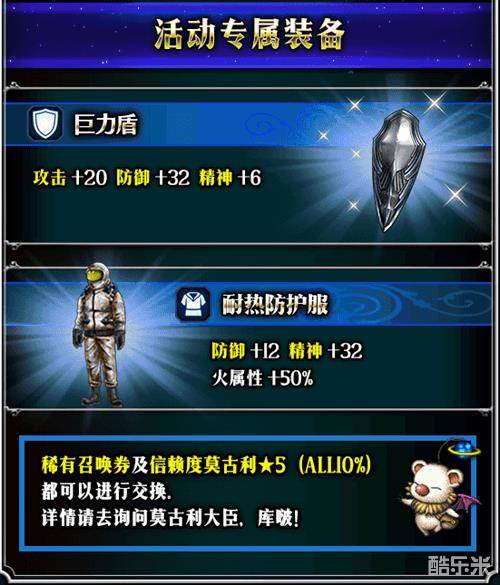 积极参加活动可以获得专属活动装备:巨力盾,耐热防护服和稀有召唤券及信赖莫古利。