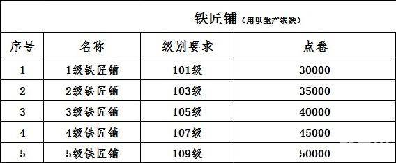 在攻城掠地里高级建筑铁匠铺要求等级101,玩家需要完成主线任务,并用点券购买图纸修建,铁匠铺的等级要求和点券消耗,如下图所示。