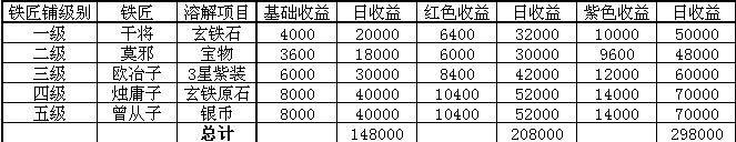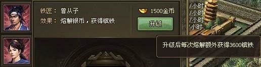 花费一万金币将全部铁匠升级到顶级,每天通过铁匠铺获取的镔铁,大概是基础铁匠铺的两倍。