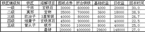 在明确了镔铁的价值之后,我们进入本文的最后一部分,铁匠铺回本时间分析。