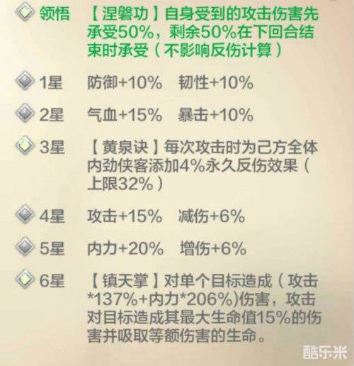 在绝学层面,“大燕世子”展现了自身反弹与控制上的优势,“涅槃功”可分回合承受敌人的伤害,而“黄泉决”可在每次攻击时为己方全体内劲侠客添加4%永久反伤效果,值得一提的是,反伤效果的叠加上限可以达到惊人的32%。而6星绝学技能“震天掌”在单体攻击的同时,还能吸取等额伤害的生命值,其强势控场的能力自不必多言。