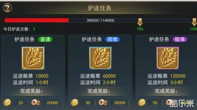 7、护送任务完成后会增加兵粮进度,进度未达到70%,在攻城战中守城武将会有生命降低的负加成;若进度达到70%,则去掉负加成;进度达到100%,则守城武将获得一个生命提升的加成。