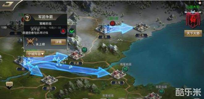 6、在策略阶段中可以调整防守阵容,并且可以选择城池派造驻扎的防守阵容。每个军团成员都可以设置最多3个防守阵容,防守阵容不可以使用在另一个防守阵容中的同一个武将和同一个神兽。