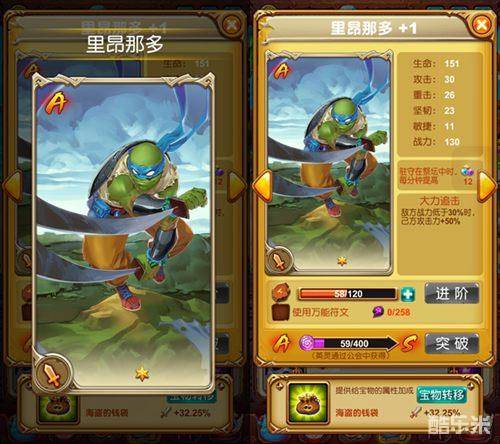 而里昂那多,作为神龟四人组中的老大,一柄双刀运用的炉火纯青!高超的攻击力使它成为队伍中的主要攻击手!技能“大力追击”可以帮助勇者们在面对地方战力低于我方战力30%时,增加我方攻击力50%!使勇者们可以用雷霆万钧之示碾压对手!体验完虐对手的快感!