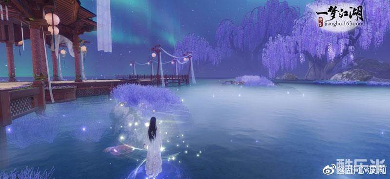 里,你可以拉住TA的手一同踏水而行。不仅如此,当你快步行走时,伴随着水波阵阵还有朵朵花瓣浮现,仿佛行走在云端,又好像真正和TA一起来到了传说中的仙境。同时“小瀛洲”里,夜空中也会概率出现极光、银汉、双月同天、月食等天象。因为有月色的照耀,和四面湖水的倒影,还有心爱之人的陪伴,这里将永远明亮,永远浪漫。