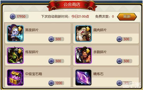 10、加入公会后记得捐献和打公会副本获得个人贡献币,公会商店会有不少好东东,可以兑换杀戮和炼狱这两个资质15的英雄碎片;