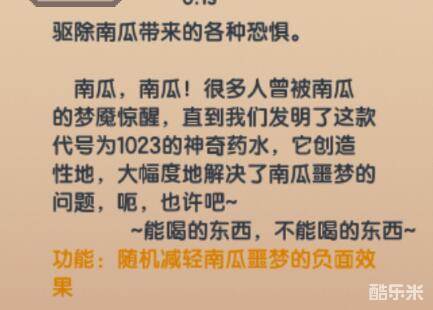 “南瓜,南瓜!很多人曾被南瓜的梦魇惊醒,知道我们发明了这款代号为1023的神奇药水,它创造性地,大幅度解决了南瓜噩梦的问题,呃也许吧~”