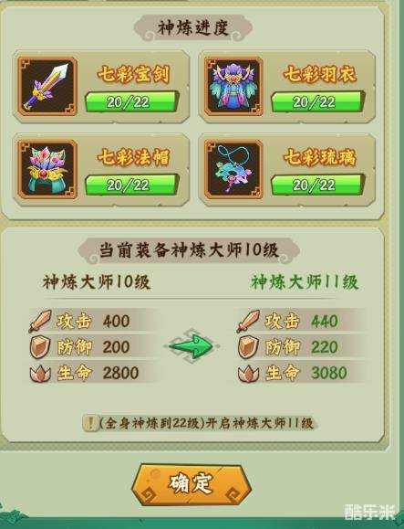 装备还可以通过消耗神炼石来进行神炼提升属性,神炼石分为初级,中级,高级,终极4种类型,金色装备神炼等级达到18级以后每5级会额外增加一次属性(详见上图七彩防具,由于神炼额外等级效果金色防具都是相同的,这里不多作解释),不同部位增加的属性不同,和装备大师一样,游戏也设置有神炼大师的效果,每10级提升1级神炼大师等级,神炼大师可以额外增加攻击,防御和生命三种属性。