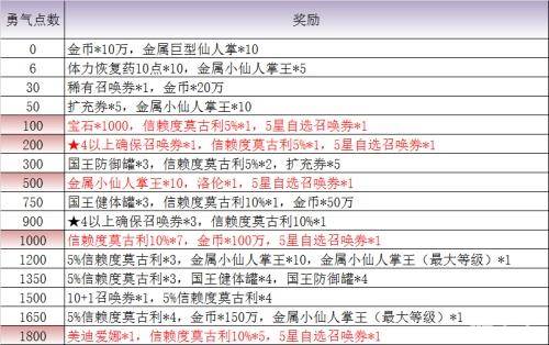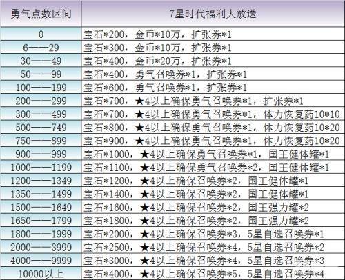 1、针对不同勇气点数区间的玩家发放相应奖励,比如达到2000点数的玩家,发放宝石*2000, 4星以上确保召唤券*3,5星自选召唤券*1