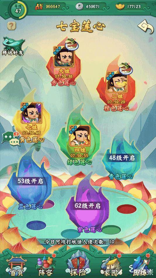 七宝莲心是你获得对应的葫芦娃碎片最直接、最容易的方式,当玩家到达对应等级后可以开启不同颜色的莲心,开启的莲心越多可以同时训练的角色越多,获取的收益越高。莲心开启后需要去挑战莲心内的幻象来获得使用权,挑战成功后可以永久使用莲心来修炼,使用莲心修炼后绝对的事半功倍。