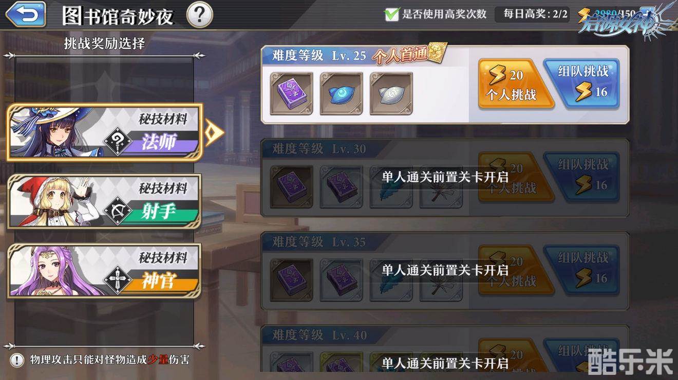 首先玩家们在进行秘技研究时,会消耗掉高级启示录、紫罗兰等材料,想要获得这些材料方法也非常简单,在图书馆勇者录和图书馆奇妙夜中就可以获得,这两个玩法每天都会有一个开启,小伙伴们多多注意哦。