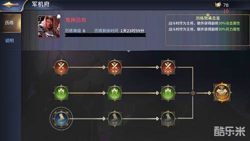 【副将系统强势来袭,巨幅增益属性令武将如虎添翼】为了不断丰富现有的战斗模式、促进更多新奇有趣的阵容搭配,全新的副将系统正式上线。玩家可在新建筑“军机府”内派遣一位武将作为主将进行历练,历练需要消耗一定数量的“诏书”,完成后主将会根据历练进度获得指定副将的部分增益属性,例如:获得副将的30%攻击、速度等等属性。需要注意的是,军机府内同一时间只能历练一名武将,每次历练将根据历练等级持续约1-2天的时间。