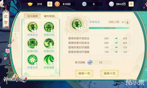 战斗修炼提升的是侠客实力的结果导向。对造成伤害或治疗、封印等结果的百分比有所增强,但这些提高都不会体现在侠客的属性面板上。战斗修炼可以通过两种方式提升:消耗鹿茸等技能培养资源,或结合帮派贡献与银币综合提升。