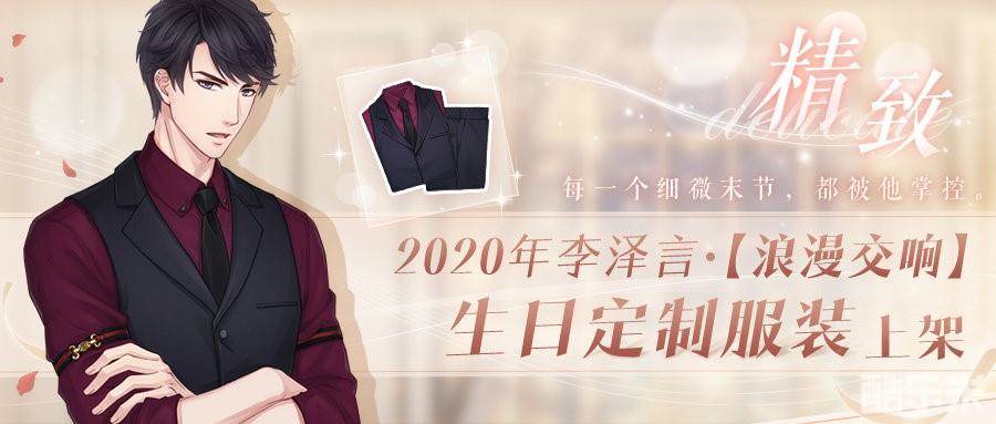 李泽言2020年生日定制“精致”主题服装将上架【去见你】,本套服装制作人仅需1枚时光解锁劵即可解锁。同时@恋与制作人官博预告,另一套定制主题服装以及两套服装的Live2D升级效果也会在后续版本中更新,敬请期待。