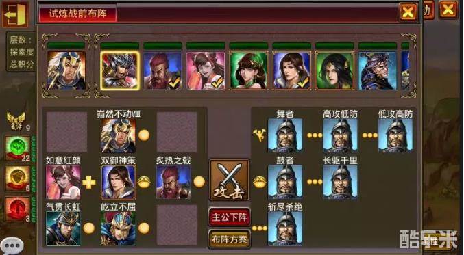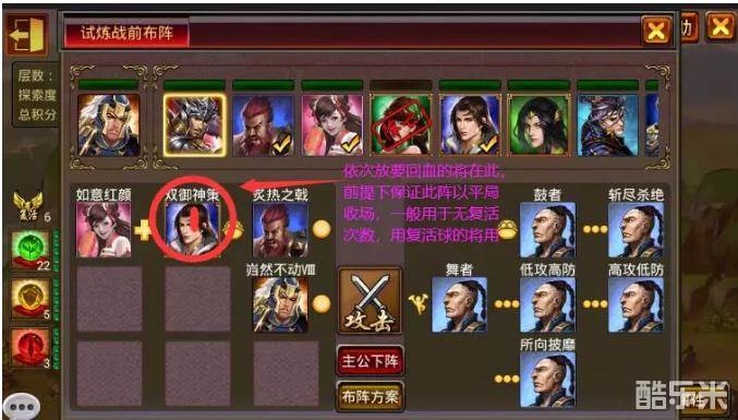 合理搭配武将,可以让试炼层数不断攀升,小胖就是用这个套路,不仅通关了前三个试炼场,连庐江试炼场现在已经到了第15层,距离通关这个试炼场不远了呢!当然你可能拥有更厉害的武将,也可能属性实力远胜于小胖,或许与通关之间只差这么一个小攻略,那就快把如意用起来吧!小弟不才,请勿见笑,不喜也勿喷哦!