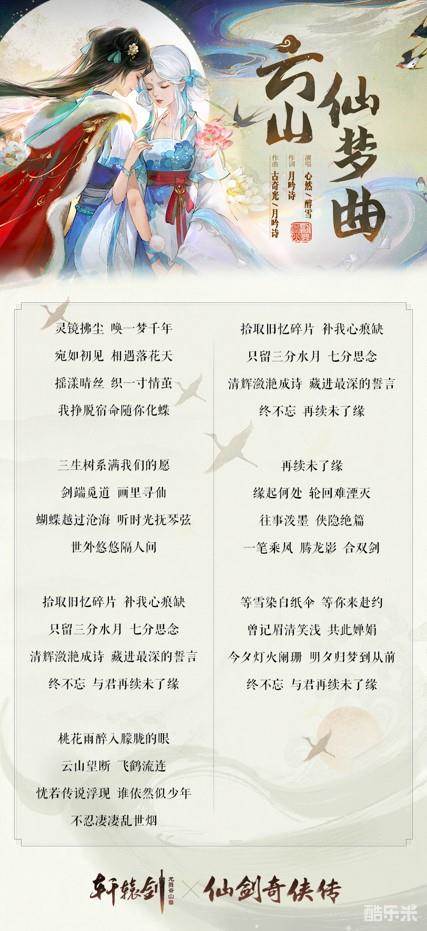 今日,《轩辕剑龙舞云山》X《仙剑奇侠传一》联动主题曲即将正式上线。《云山仙梦曲》由忠实玩家、音乐人月吟诗创作,知名古风歌手心然、醉雪演唱。