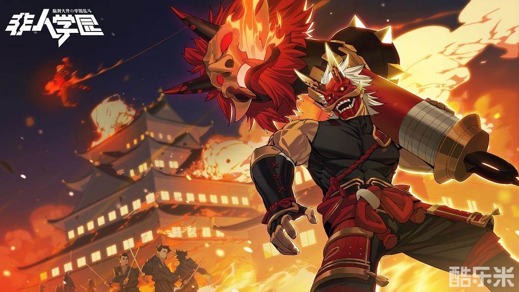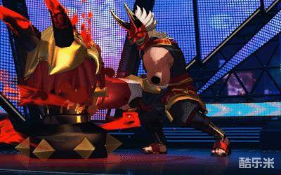 阿蛟的定制级时装【崇岳】,主题为日本战国风武士。在天守阁前,燎原的烈火正熊熊燃烧,阿蛟身着武士铠甲,头带面貌狰狞的恶鬼面具,两支剑角冲天而起,铜铃般的眼睛闪着红光。