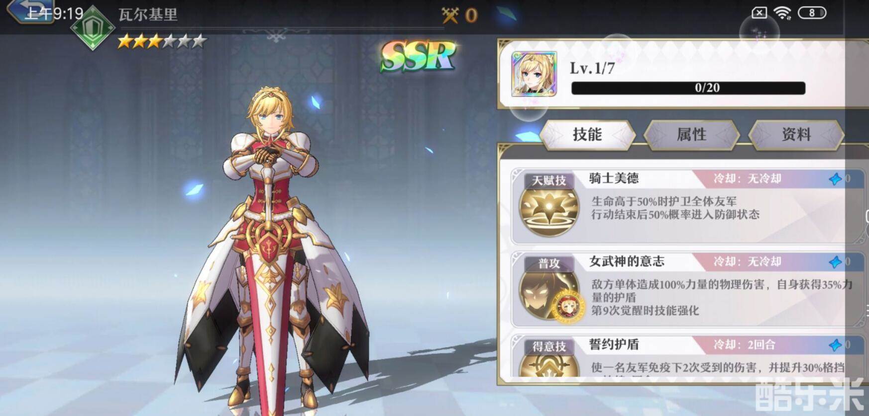 | 支援技能 | 星辉礼赞 | 战斗开始获得1能量,对全体友军释放90%智力加700的护盾,然后增加2点能量 |