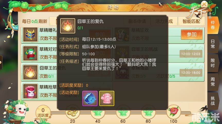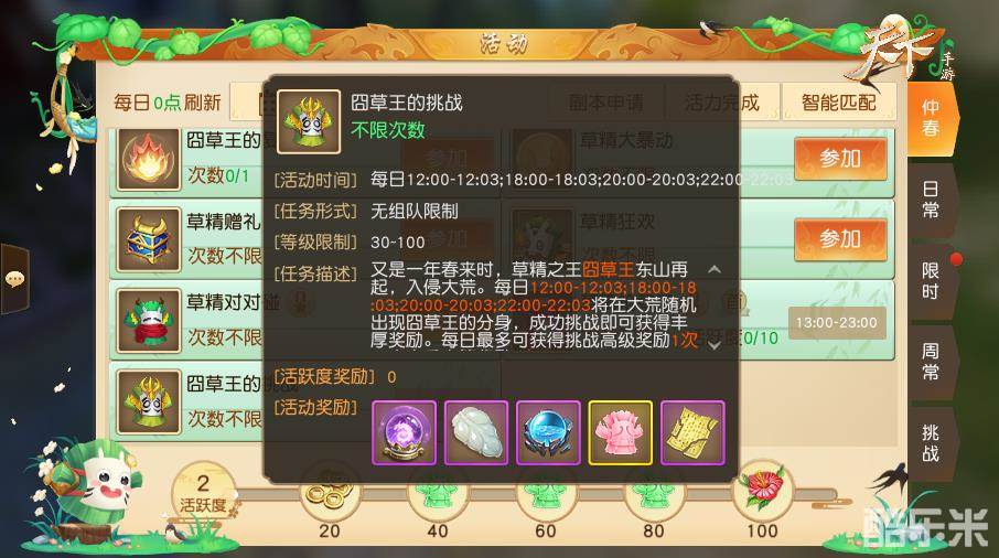 《天下》手游仲春季活力开场!可恶的囧草王又趁着春天实力大增,再次重返大荒搞破坏。岂能让他得逞!即日起“仲春”系列九大草精活动全部开启,赠礼、狂欢、海盗、抢草王、对对碰等趣味玩法欢乐无限。现在参与“囧草王的挑战”活动击退囧草王分身,就可赢珍稀道具奖励。来“囧草王的复仇”活动现场,还能替世界BOSS教他做“妖”的道理!情况紧急,日常NPC全被草精替换,欺人太甚!快换上伪装,打通“草精大暴动”活动副本。做盖世英雄,你也可以!