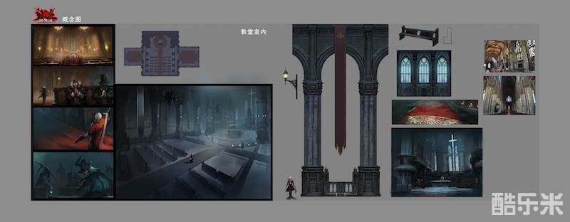 从教堂的建筑概念设计可以看出教堂内部具有庄严的气质,从挑高的门厅和气派的大门到半圆形的拱窗立于二层的回廊之处,每次转角的石砌与琉璃砖瓦的搭配都透露着设计师严谨的考究,教堂的整个设计上偏向于“鬼泣”系列中的魔剑教会设计风格,但连续的拱门和回廊,却又是具有自身的设计特色,比起白色的雅致,黑色的经典这两个永恒不变的主打色,《鬼泣-巅峰之战》选择了交汇的“灰”,玩家们的头顶上是尖形双拱屋顶,琉璃装饰着金色百合花图案,玩家的脚下是蓝灰相间的大理石地面。几步开外有根高大的柱子,大厅纵深一共竖着四根大柱,支撑着双拱屋顶落在横向正中的拱底石,而那里,则是教堂的正中央,接受所有信徒的礼拜之所。