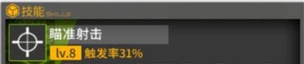 长时间,大幅度降低一个敌人的闪避值。该技能的逻辑是,对RF当前攻击的敌人使用,因此在清小怪的时候一点卵用都没有,技能等级高了持续十多秒,然而你见过哪个小杂兵被RF集火了能活过2秒的?对BOSS还算有点用,不过不如上面两个技能,总体来说是比较鸡肋的RF技能。
