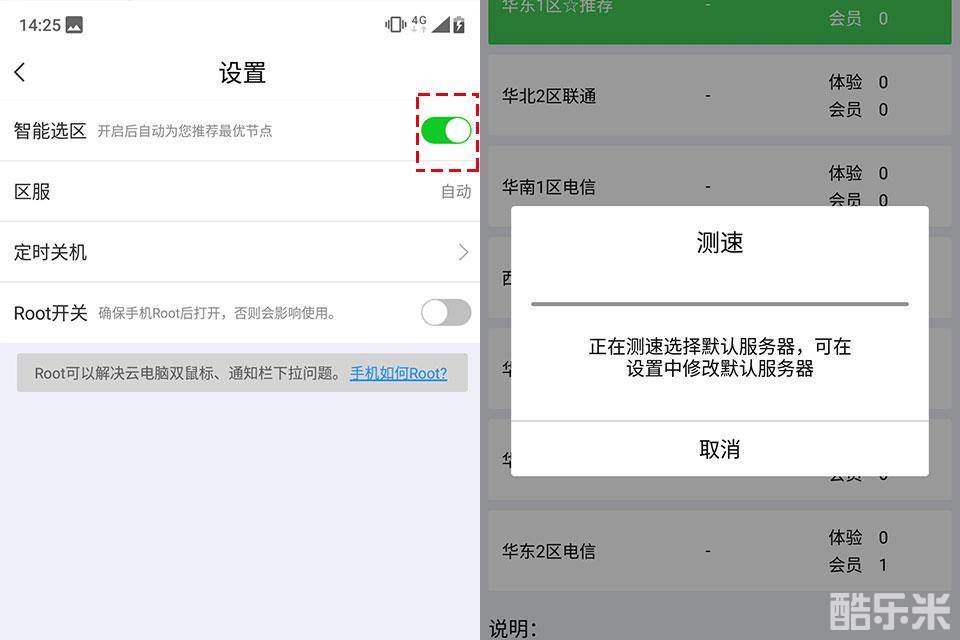 3、选择您所在的地域,进行测速,可选自动选区和手动选区。