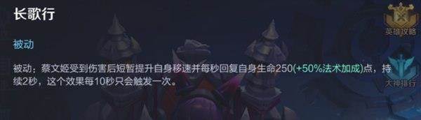 被动技能是蔡文姬可以在战斗中持续作战的一个重要依靠,受到伤害之后提升自身移动速度,以及恢复自身血量,可以让蔡文姬在团战中不会被轻易击杀,被攻击时可以利用被动的增益逃脱。蔡文姬的被动有一个小技巧,可以利用野怪的攻击触发被动来回复血量,在血量不足时,攻击野怪引发野怪的仇恨,被野怪攻击后触发被动回血,然后跑开,但是不要在开团前使用,因为被动在团战时有保命效果。