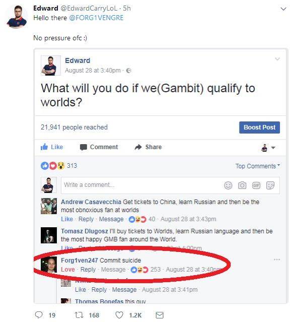 在早些时候,当他问到“如果我们(Gambit)进入世界赛了你会怎么做”时,前H2K战队ADC选手、现推特圣手Forg1ven在下面回复“我会去自杀”。现在Forg1ven似乎陷入了尴尬的境地……