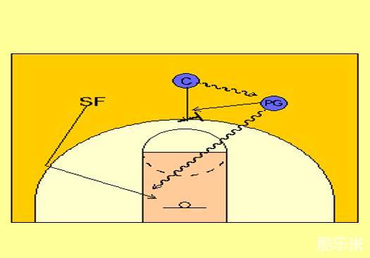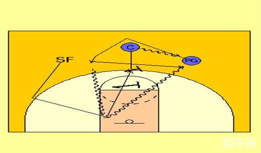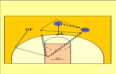 对方的内线提上来防守,C同样也是要用小力快速吸到对方内线,然后将球传给PG,随时做好为PG做掩护的准备,此时PG需要注意观察SF的走位情况,随时将球传给空切上篮或者反跑投篮的SF。