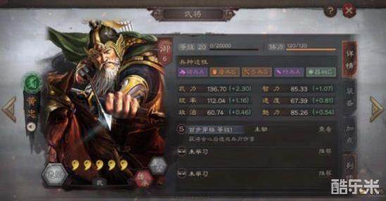 《三国志·战略版》中,黄忠统御6,定位【武】——武力超群、擅长兵刃攻击的猛将。精通盾兵(S),弓兵(S),擅长骑兵(A),枪兵(A),了解器械(C)。从兵种适性上来看,黄忠是一个非常百搭的武将,骑盾弓枪4个兵种可以随意切换。